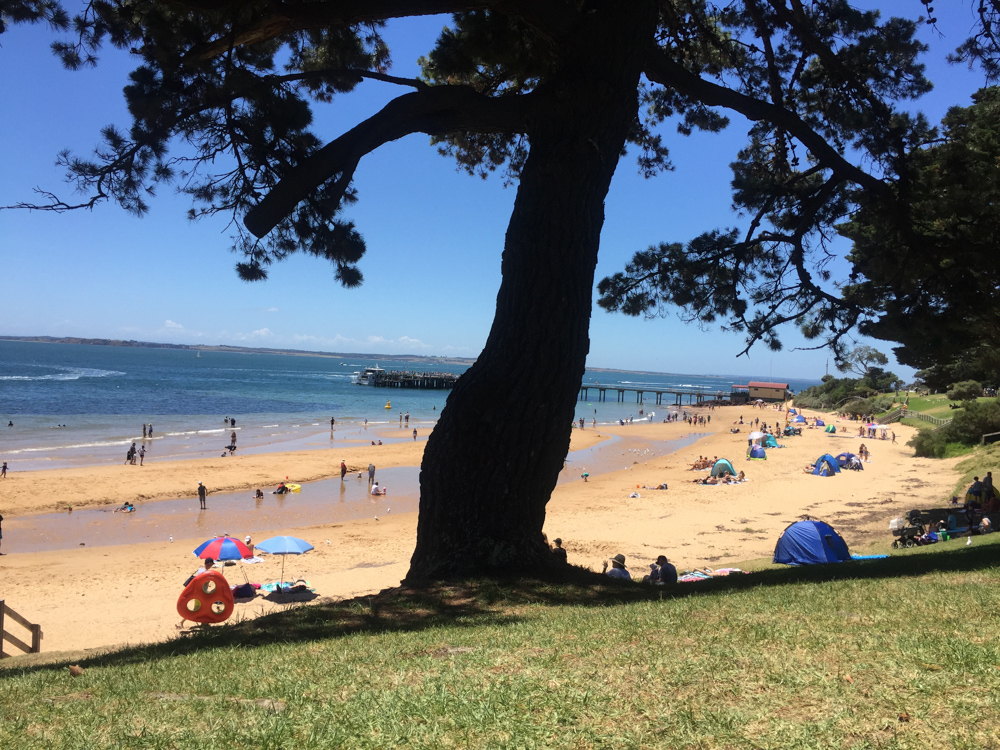 Cowes beach , unlike many other beaches, has a beautifully grown, well maintained, foreshore reserve along the long stretch of the beach. there are plenty of large trees for shade and grass to sit on and relax. This was my favourite thing about this lovely beach – Cool and safe spot to relax with my youngest baby , while watching my older kids playing at the beach with my husband.
